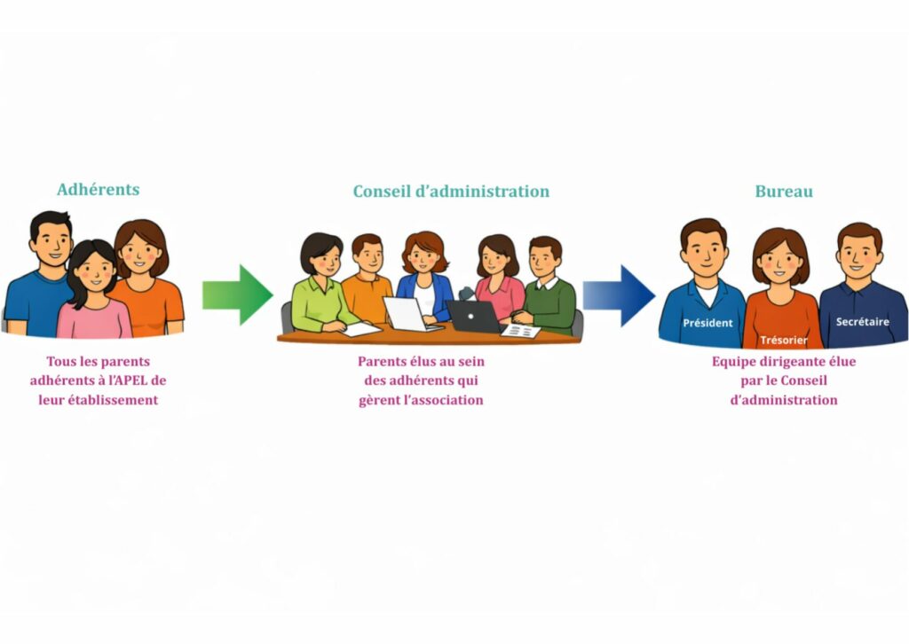 Comme toute association Loi 1901, l’Apel est administrée bénévolement par un conseil d’administration (CA). Ce dernier est composé de membres élus (devant être à jour de leur cotisation) au sein des familles adhérentes pour trois ans par l’assemblée générale ordinaire. Il est très important de distinguer le CA du bureau.